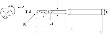 直徑d 刃長l 全長L 柄徑D 有效長L1 R徑 刃數Z |